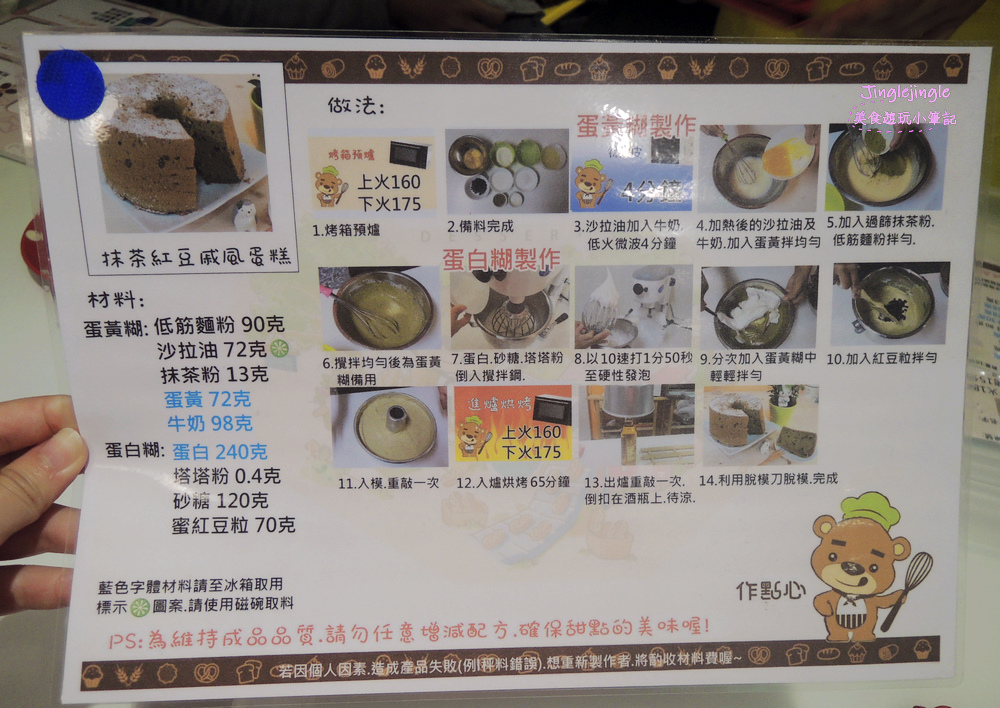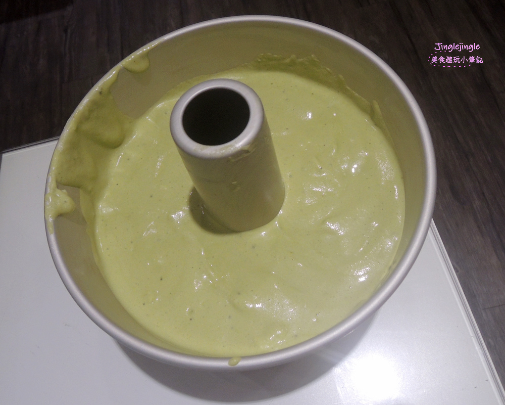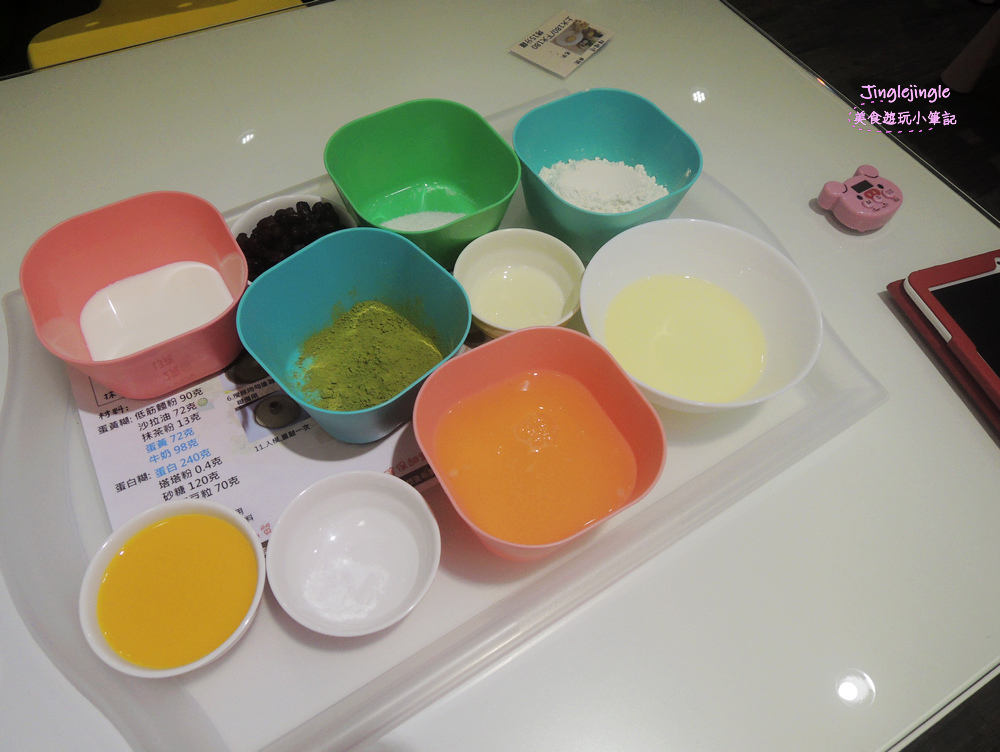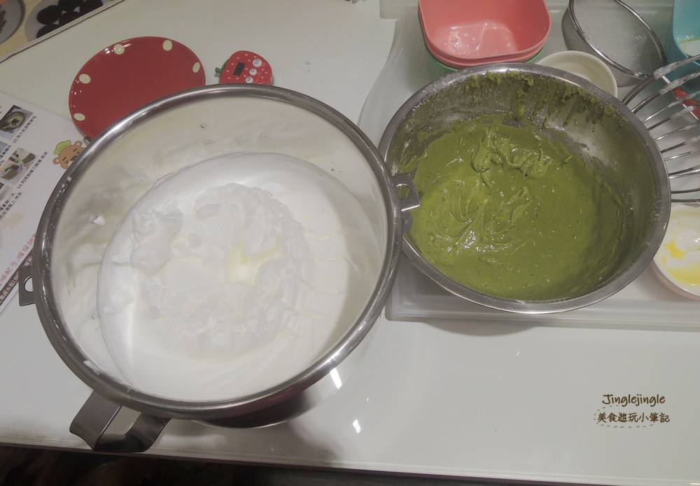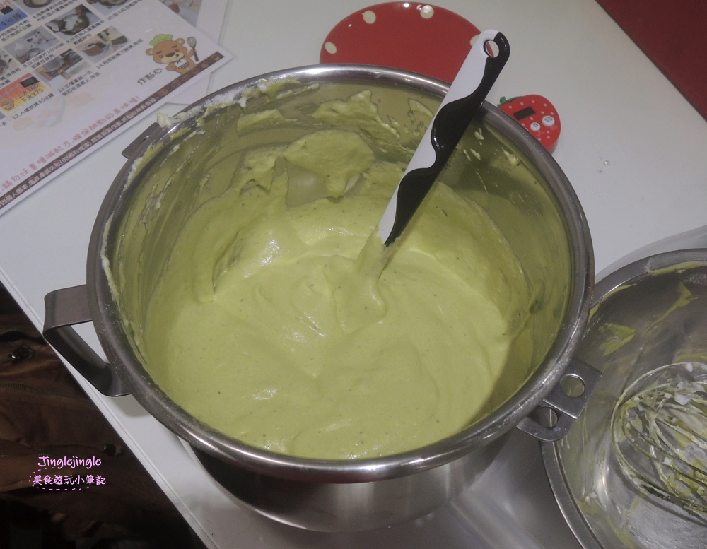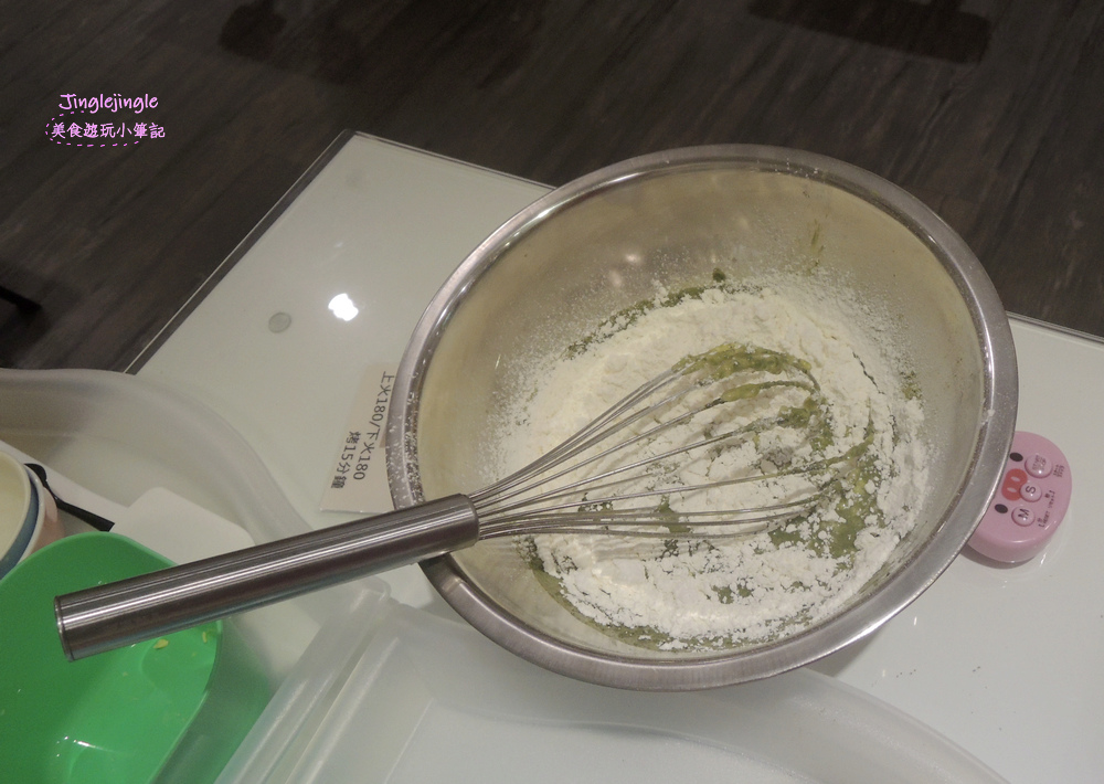 我主要是做抹茶戚風蛋糕,其實就是不斷的把原料拌勻XD