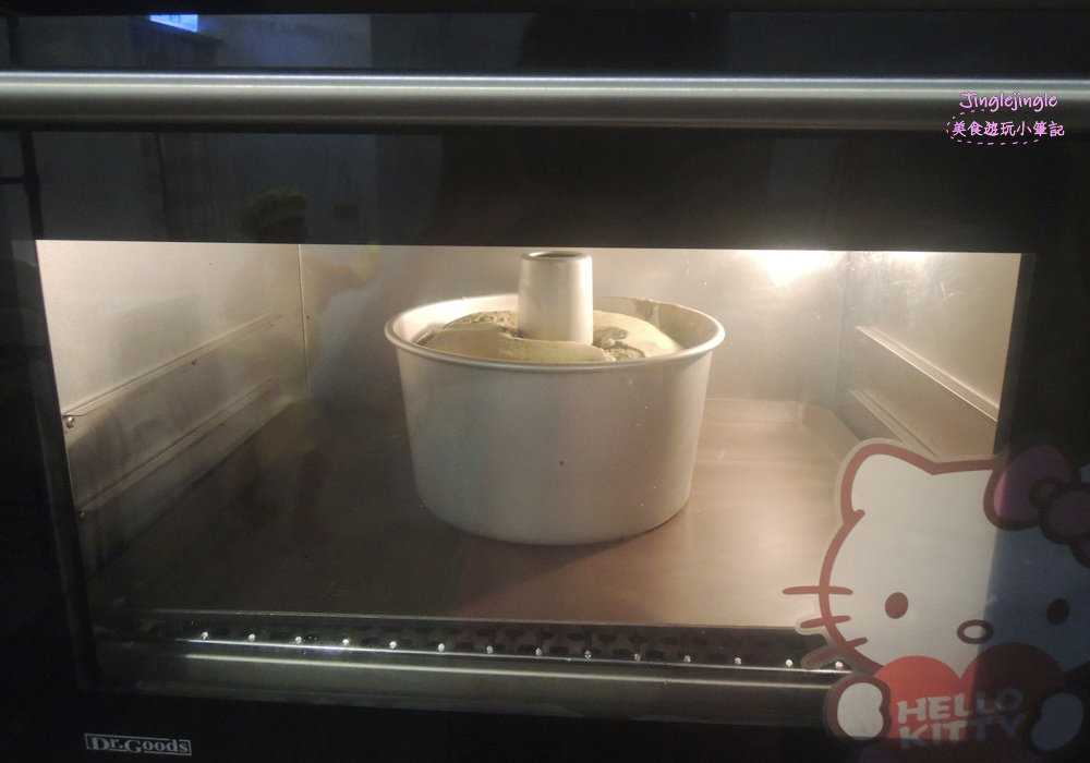 戚風烤滿久的,大約一小時,在送進烤箱等蛋糕長大的時候可以去二樓作飲料,或是稍微收拾一下桌面和碗盤.....